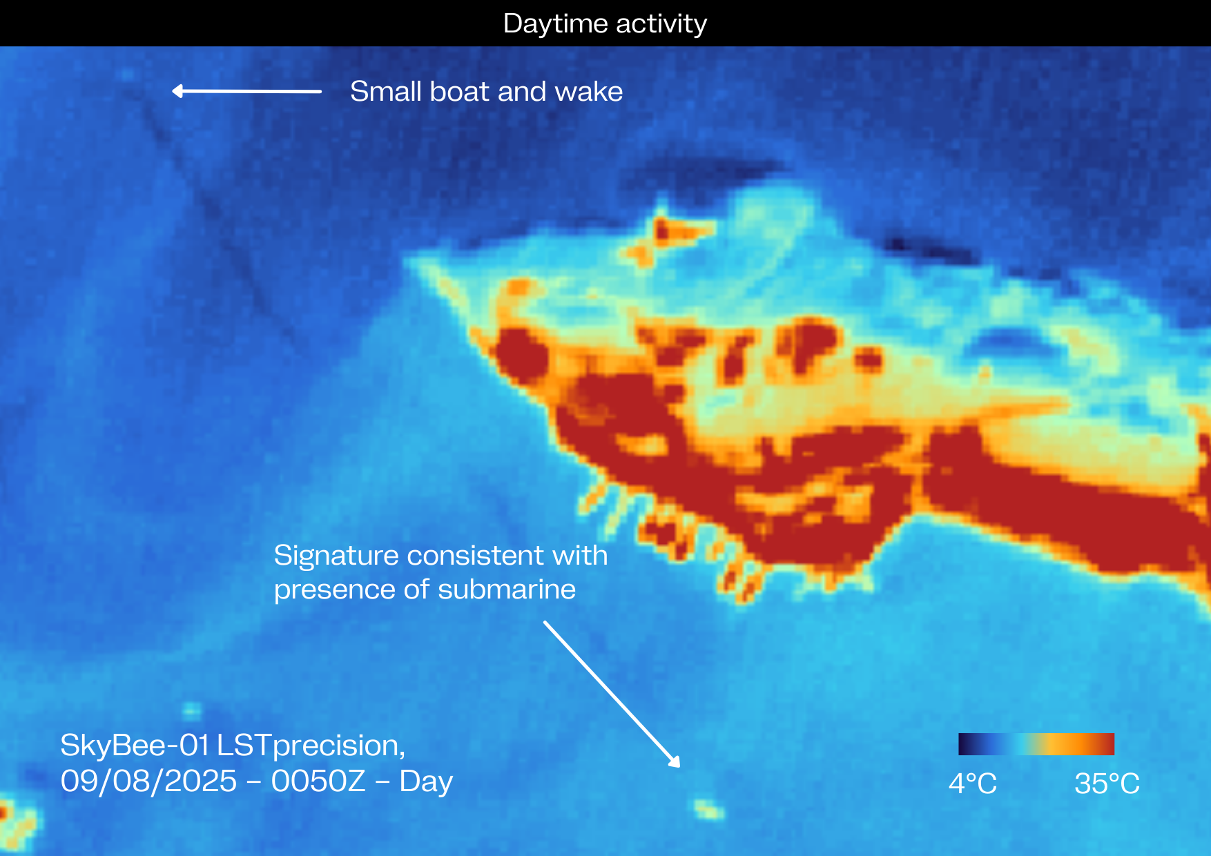 In one recent intelligence request, constellr’s thermal infrared data was used for strategic intelligence to monitor maritime activity in the vicinity of the Rybachiy nuclear submarine base in Russia. By detecting subtle temperature variations on the water surface and around pier infrastructure, constellr enabled the analysis of vessel presence and movement patterns, particularly during night-time operations where optical imagery is limited. Thermal signatures of wakes remained observable for up to 60 minutes, allowing inference of direction and speed of vessels, while distinct thermal patterns around piers confirmed presence of submarines. This thermal layer complements very high-resolution optical data and serves as an independent means to corroborate and validate open-source intelligence, which can be scarce or unreliable. Thermal analysis can be used to assess critical infrastructure including missile fuel depots, covert manufacturing sites, and critical logistics hubs.