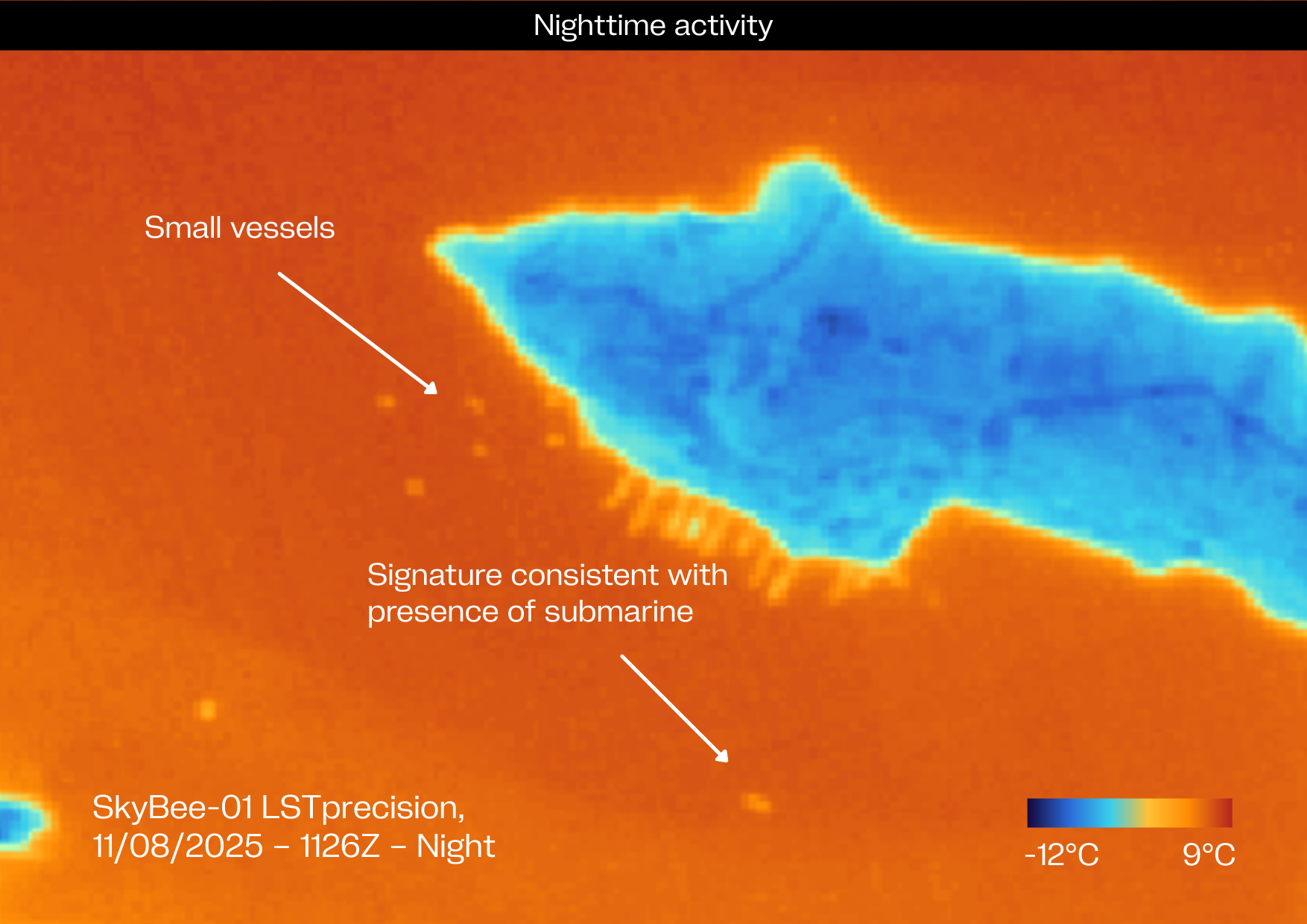 Image 2 – Nighttime activity: Thermal infrared intelligence highlights small vessel operations and sustained subsurface heat signatures during night conditions. The data enables continuous monitoring of maritime behaviour independent of visibility or light.